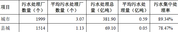 截至2013年末,国内城市与县城污水处理厂数量及处理率的对比如下: