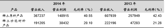 北方稀土2014年营业收入583783万元,营业成本392392万元,毛利率32.78%,稀土原料产品营业利润148915万元,占总营业利润比重79.49%;稀土功能材料产品营业利润38432万元,占总营业利润比重20.51%。