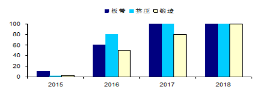 2015年,公司航空材料事业部进入投产期,全年板带材料达到了设计产能的10%,挤压和锻造实现小批量试产。预计2016年板带产量将达到设计产能的60%,挤压达到设计产能的80%,锻造达到设计产能的50%;到2018年板带、挤压、锻造将全面达产。