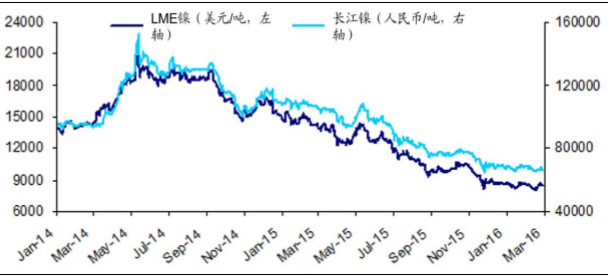 2015年镍价单边下滑,国内外市场镍价跌幅接近50%,创10多年以来新低。