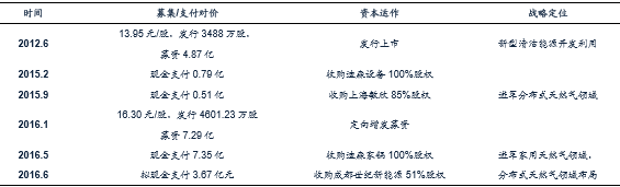 定位清洁能源综合服务商,激励计划谋求长远发展:公司原为国内生物质供热领先者,16年通过多次收购,完成清洁能源综合服务商的战略升级,特别是在燃气分布式领域的布局:世纪新能源(51%股权,现金3.67亿元,分布式天然气项目)、迪森家锅(100%股权,现金7.35亿元,家用燃气锅炉)、收购迪森设备(100%股权,现金0.79亿元,燃气锅炉)等。公司通过核心合伙人持股计划(合计金额1.26亿,存续期6-8年)+股权激励+事业合伙人机制确立了内外双向激励机制。公司15年营收5.09亿元,归母净利0.43亿元。