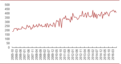 印度原油需求:随着印度经济的持续发展,印度原油净进口量持续增加。2005年10月,印度原油净进口量为186.9万桶/天,到了2015年1月,这一数据增长到418.3万桶/天。然而,在2015-2016年全球原油供给过剩期间,印度进口量没有增长。2016年进口量在410-440万桶之间震荡,2016年7月进口量为408.8万桶/天,比去年同期减少9.9万桶/天。