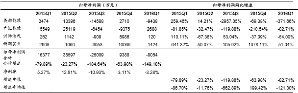 整体而言,2016Q1油气开采行业上市公司归属净利润整体增速出现下滑,同时各公司之间分化较严重,净利润增速差别很大。