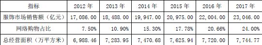 品牌服饰零售终端指以销售品牌服饰为目的,以专卖店、旗舰店、形象店等业态存在的实体门店。品牌服饰零售终端是商品式商业照明市场主要细分市场之一,根据国家统计局我国服饰行业规模以上门店2.26万元/平米的历史平均平效以及中为咨询我国服饰市场销售规模及网络购物占比的数据计算,2012-2017年间,我国品牌服饰市场总经营面积分别为6,988.46万平方米、7,283.95万平方米、7,470.68万平方米、7,625.94万平方米、7,720.00万平方米和7,744.77万平方米。2012-2017年我国品牌服饰市场销售额、网络购物占比及经营面积情况