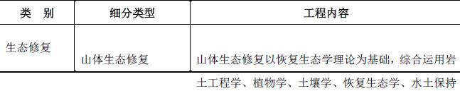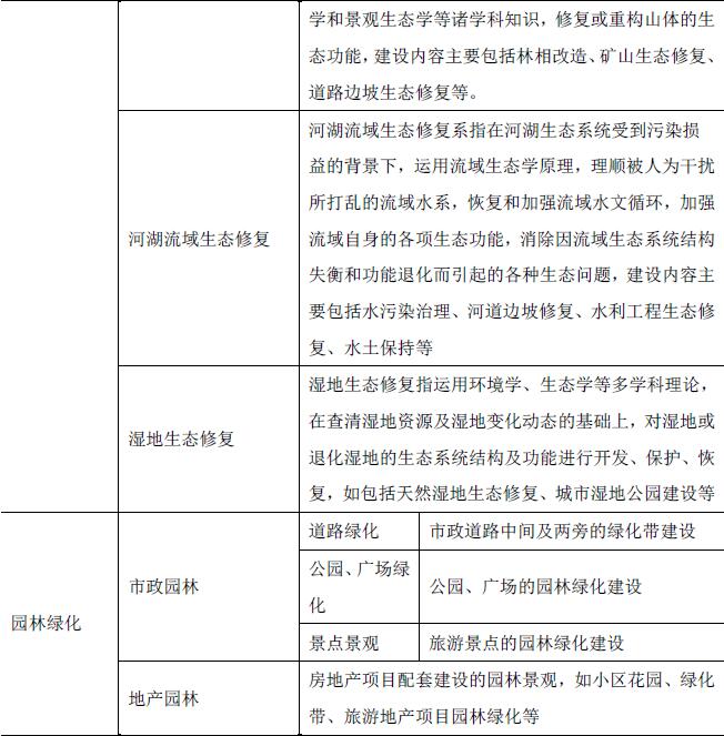 根据工程目的、施工场所、应用技术等的不同,园林生态工程可以分为生态修复和园林绿化两大类别,具体情况如下表: