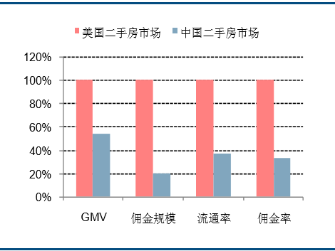 以二手房发展较为成熟的美国为例,行业调查报告中国的二手房的GMV为美国的54%,佣金规模仅为美国的20%,而流通率和佣金率为美国的37%和33%,各项指标和美国都具有较大差距。随着存量房交易的活跃度的提高,我们认为中国二手房的佣金规模与流通率等指标也会进一步提高,而二手房经纪业务服务商将成为中国存量房市场发展的获益者。
