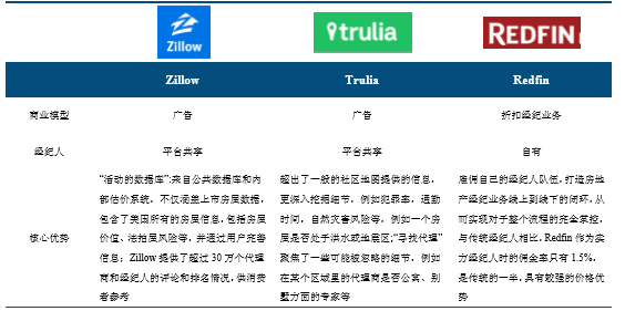 美国市场主流的房地产在线经纪服务商主要有Zillow、Trulia以及Redfin,Zillow与Trulia主要作为平台服务商提供房源信息并通过注册的平台经纪人进行盈利,2014年Zillow收购了Truilia,构建了强有力的线上服务内容提供与巨大流量资源;而Redfin采用自有经纪人模式,通过打造经纪业务线上到线下的闭环,通过流程掌控细分形成自有的核心优势。而搜房为起步较早的国内在线经纪服务商,搜房核心的盈利业务为一手营销广告和二手房源广告,但与美国主流的房地产在线服务商所提供的服务仍有较大异同。