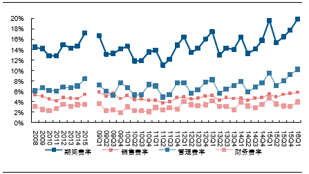 建材行业费用率情况:15年为17.12%,同比提升2.4个百分点