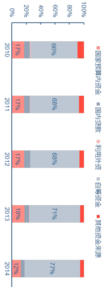地方债务负担限制了财政政策的使用空间。基建项目多为地方财政主导,对于资金密集型的基建行业来说,地方财力直接决定了财政政策支持基建的空间。基建投资资金来源中,国家预算内资金只占约17%,而自筹资金比例逐年提高,已超过70%。自筹资金主要包括自有资金、政府性基金、地方债等,由于地方政府的举债能力受到财政部43号文件的限制,加上通过土地出让获得的政府性基金收入难以持续增长,对于严重依赖自筹资金的基建投资来说十分不利。基建类行业资金来源(%)