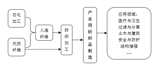 产业用纺织品上游是化工工业,石油经提炼加工所产生的涤纶、丙纶、锦纶等化学纤维是生产无纺布的主要原材料。其下游主要为各工商企业客户,包括医疗与卫生机构、过滤与分离作业、土工与建筑作业、安全与防护品制造、结构增强品制造、农业、包装、文体与休闲产品制造、蓬帆类产品制造、隔离与绝缘产品制造等等其他领域。