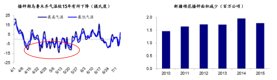 国内4月份播种季起,新疆地区的气温较去年有所下降,发芽期适温较低会影响全年的棉花产量,叠加2015年度新疆种植面积由14年1.95百万公顷减少至1.77百万公顷(下滑幅度9%),2016年度新疆棉区产量或将较去年有所减少。