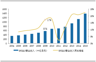 2009年,日本百货业降幅达10.01%,优衣库却逆势增长,仅优衣库品牌销售实现5760亿日元,同比增长17%,母公司迅销集团获得净利润544亿日元,较前年增长24%,这充分说明了在经济低迷的环境下大众消费人群对于高性价比的服饰的需求。