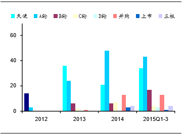 2013年69起投资中,天使和A轮分别为36、24起,合计占总投资数的87.0%;2014年103起投资中,天使和A轮分别为21、48起,占总投资数的67.0%;2015年1-9月121起投资中,天使和A轮分别为34、43起,占总投资数的63.6%。