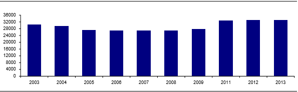 2003-2013国家20-34岁适育年龄人口情况(万人)