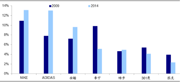 耐克与阿迪达斯在我国运动鞋服领域的优势仍然存在,并且在加强,二者在中国市场的市占率从2009年的约18%提升到了2014年的26%。而内资品牌方面,安踏超越李宁成为内资品牌市占率第一,其他内资品牌有升有降,但是,五大内资品牌总计的市占率从2009年的31%下降至2014年的26%。除了耐克、阿迪两大巨头的竞争之外,一些来自于国外的专业化、细分化的品牌竞争也不可忽视,包括专注于跑步的NEWBALANCE、专业运动的underarmour、舒适休闲的SKECHERS,这些品牌在国际市场上取得了快速的发展,并开始逐步进入国内市场,对内资品牌构成一定威胁。