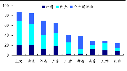 从地域分布上来看,北京、上海等发达地区国际学校数量要明显占优;从三种学校的结构来看,内陆地区国际班的占比相对较高,而上海、北京、天津等发达地区民办国际学校的比重较高,这也侧面反映出经济较发达地区家长的教育消费能力更强。