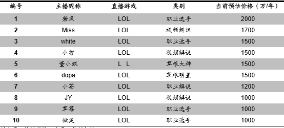 游戏主播年薪过千万,收入堪比一线明星:从2014年到2015年,游戏主播身价实现飞速增长,普遍增幅都在10倍以上。游戏主播若风的身价已经达到2000万,已经超过2015年福布斯名人榜上张杰、冯绍峰的收入。若风、Miss、white、小智这一类的人气主播,是各个游戏直播平台争抢的对象。为了吸引提升人气,各平台掀起不计成本、互相挖角的大战。斗鱼TV曾斥资6000万,在一个月之内从虎牙直播挖走6位人气主播。