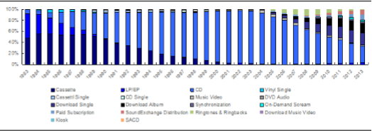 美国音乐产业30年面面观。音乐载体从最初的录音带到CD播放器,发展到现今的数字播放(iTunes)和数码音乐(Spotify),音乐产业历经了巨大变化。