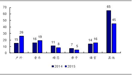 受‚限娱令‛等政策影响,卫视综艺节目数量减少。2015年卫视综艺节目119档,相比去年减少了9档,其中周末综艺节目减少近8%,而户外类节目数量增长70%,音乐类综艺节目数量也从2014年的16档增加到2015年的19档,表明户外类和音乐类综艺节目发展态势良好,虽然限娱令的颁布对综艺节目带来负面影响,但音乐类综艺节目内容优质,收视率高,仍逆势增加。