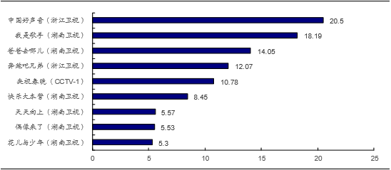 电视音乐节目层出不穷,衍生产业前景广阔。据2015音乐产业发展报告显示,2014年全国音乐类广播频率共计88个,占市场份额18.46%,仅次于新闻综合类与交通类频率,音乐类频率广告费约15.4亿元。全国电视音乐类节目约105档,电视音乐真人秀节目21档,音乐节目总体冠名费收入在23亿元以上,热门音乐综艺节目冠名费迎来3亿时代,由此看来,电视音乐及相关衍生产业有着广阔的市场前景。