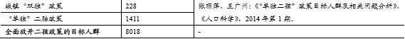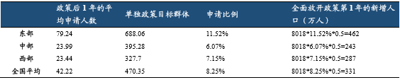 2013年的单独二胎政策放开后,从申请二胎的比例来看,不同地区的比率从6-11.5%不等,全国平均水平为8.25%(申请数量除以对应符合条件的育龄妇女数量)。从申请数量的变化来看,呈现逐渐衰减的特征(附件1)。统计数据显示,申请后实际生育比例,约50%。根据以上实证数据,我们估算全面放开二胎政策实行的第1年带来的新增人口大致为500万。此后逐年递减,短期人口增量可能会在未来5年释放,共计1500-2500万。