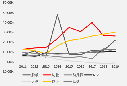 职业教育、早教及幼儿园自然增速最快,存在大量机会。