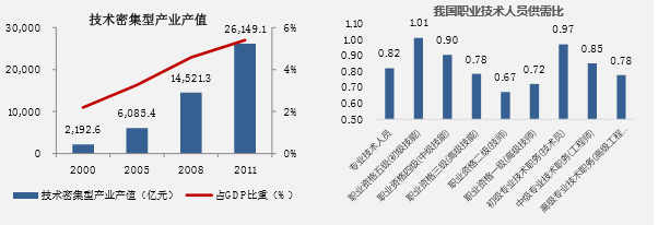 我国技术密集型产业占GDP比重不断上升,而就业市场中高级技术人才供需比低于1