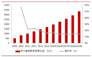 根据弗若斯特沙利文的预测,至2019年,我国民办基础教育经费总收益将超过3000亿元,2015-2019年的CAGR为14.7%。