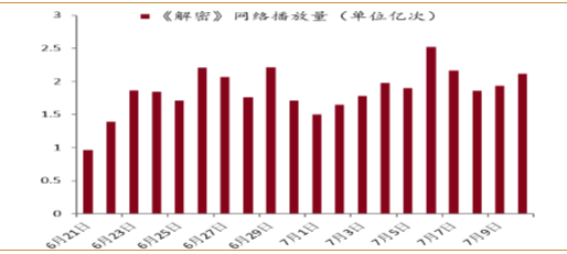 《解密》是华策影视出品的青春励志谍战剧,改编自麦家同名小说,由陈学冬、颖儿主演,于2016年6月20日在湖南卫视金鹰独播剧场每晚19:30播出,视频网站覆盖了搜狐视频、芒果TV、爱奇艺、优酷、腾讯视频。开播以来,热度节节攀升,目前收视率2%左右、市场份额6%左右,稳居同时段第一位置;单日网络播放量稳定在2亿次左右。这部作品成功的原因除了故事本身张弛有度、节奏明快、悬念环环相扣之外,陈学冬等偶像派小生的加入也增色不少:陈学冬曾主演青春时尚片《小时代》男主角,微博粉丝高达2340万、多数为85后-00后,本身已经自带粉丝集聚的光环,在此基础上,颖儿、经超、张哲瀚等帅哥美女的加入也确立了作品“红色青春偶像”的画风。在此基础上,《解密》放弃了天生就是英雄的人物设置,从并不完美的主角逐渐成长的角度切入,进一步赢得了年轻人的好感。作品播出后,“你的名字无人知晓,你的功绩与世长存”这样标志性的台词一时成为90后追捧的网络流行语。
