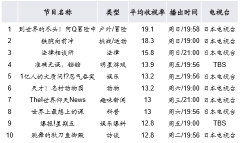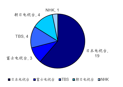 日本的电视台数量超过百家,以国营的NHK电视台,以及日本电视台、富士电视台、朝日电视台、TBS电视台、东京电视台这五大民营电视台为主。由于竞争异常激烈、淘汰率高,综艺节目的收视率成为决定性指标。在2015年平均收视率排名前30的综艺节目中,日本电视台数量占比超过60%、占据绝对优势,其代表节目包括《到世界的尽头!阿Q冒险中》、《铁腕,rush!》、《世界上最想上的课》等。