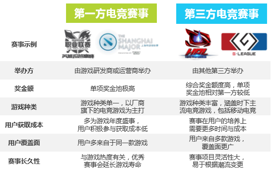 根据举办方的不同,电子竞技赛事可分为两类:第一方电子竞技赛事:由赛事游戏项目的游戏研发商或运营商所举办的电子竞技相关赛事。第三方电子竞技赛事:由赛事游戏项目的游戏研发商或运营商之外的第三方组织所举办的电子竞技相关赛事。