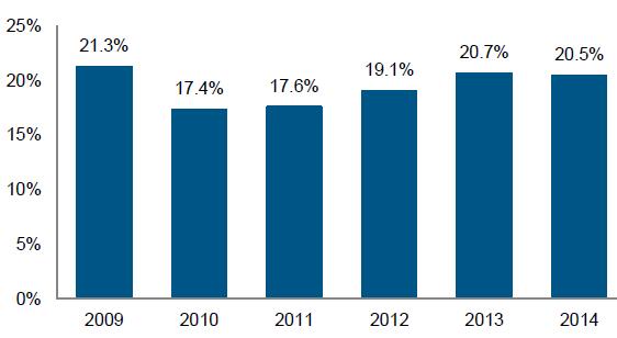 尽管影视制作为创新的起点和IP价值资源所在,而主题乐园则为价值持续变现的承载主体。近几年,迪士尼公司收入呈现稳步增长态势,2011年迪士尼营业收入突破了400亿美元,此后增速不断加快,至2014年迪士尼营业收入达到488亿美元。2009-2014年,迪士尼营业收入复合增速达6.19%,其中主题乐园营收复合增速为7.20%,主题乐园收入占总收入的比重自2010年开始逐步上升,2012年占比超过30%,此后一直保持在30%的水平之上。华特迪士尼营业收入及增速