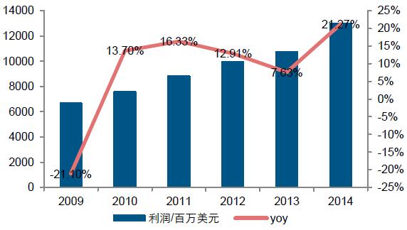 迪士尼毛利额稳步增长,2013年突破100亿美元,至2014年迪士尼全年实现130亿美元。2009-2014年,毛利额复合增速为14.28%,主题乐园毛利额复合增速为13.43%,毛利额占比保持20%。华特迪士尼利润(百万美元)及增速(%)