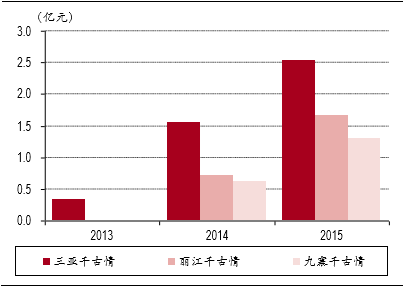 千古情系列厚积薄发,异地成功开拓带动宋城演艺业绩爆发。宋城演艺三个异地项目三亚(2013年9月开业)、丽江(2014年3月开业)、九寨千古情(2014年5月开业)均在开业后快速度过培育期,在开业当年可实现盈利,并在第二年获得大幅增长。三亚千古情2013-2015年分别实现营业收入0.34、1.55、2.53亿元,丽江千古情2014-2015年分别实现营收0.72、1.68亿元,九寨千古情2014-2015年分别实现营收0.62、1.30亿元,异地千古情系列的持续发力,使得公司主业在2015年贡献净利润达到5.37亿元,同比增长48.9%,未来随着桂林、上海、张家界、宁乡项目的开业,有望再次迎来业绩的爆发。
