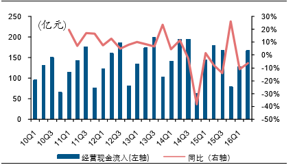 其中经营现金流入为168亿,同比下降6%,经营现金流入下滑幅度小于收入下滑幅度,经营现金流出为130亿,同比下降1%,啤酒行业经营现金净流入下滑主要是由于流入减少。