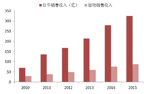 国内功能性饮料品牌增长快速,红牛仍然占据绝对优势。红牛中国销售收入2015年预计在300亿以上,占据中国运动型饮料的半壁江山,达能的脉动紧随其后,收入逐步赶超百亿,其他如乐虎、东鹏特饮等也有一定市场。红牛脉动在较大体量基础上仍保持两位数增长。红牛脉动中国销售收入变化