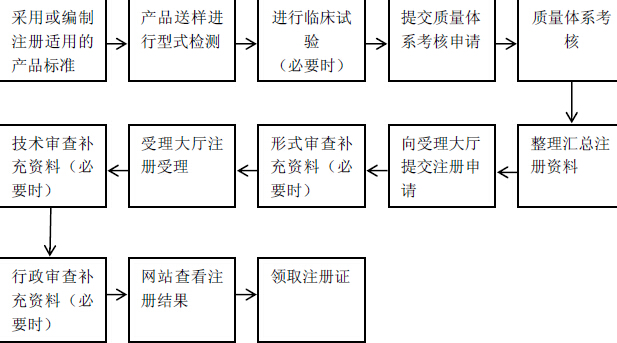 我国医疗器械产品注册机构是国家食品和药品监督管理总局(CFDA)及其下属机构。我国将医疗器械按风险等级分三类。一类医疗器械是指通过常规管理足以保证其安全性、有效性的医疗器械,二类医疗器械是指对其安全性、有效性应当加以控制的医疗器械,三类医疗器械是指植入人体、用于支持、维持生命或对人体具有潜在危险,对其安全性、有效性必须严格控制的医疗器械。一类医疗器械由设区的市级药监局负责,二类医疗器械由省级药监局负责,三类产品由国家食品药品监督管理总局(CFDA)负责注册。各地注册流程略有不同,不同产品注册流程也略有差异,一般程序如下: