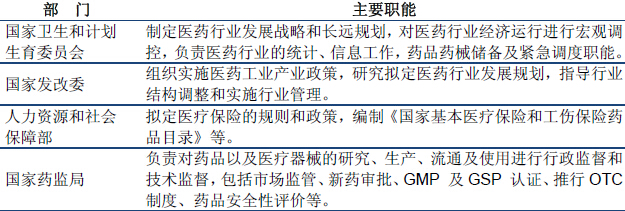 医药行业的主管部门为国家药监局、国家卫生和计划生育委员会、国家发改委、人力资源和社会保障部等,其中国家药监局负责对全国医药市场进行监督管理,省一级设立食品药品监督管理局,负责本行政区域内的食品药品监督行政管理工作;省以下包括地(州、盟)、市食品药品监督管理局,为省药监局的业务直属机构。上述各部门具体监督管理职能如下:
