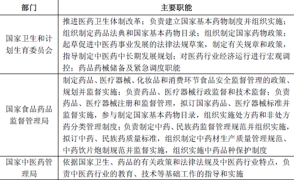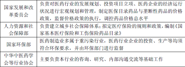 由于医药行业与人民生命健康密切相关,属于国民生计的重要产业,药品的生产、流通和使用等各环节均受到政府有关部门的严格监管,我国医药行业主要由以下部门进行监督管理,具体情况如下表所示: