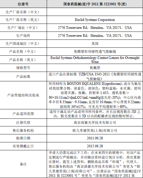 美国欧几里德公司(EuclidSystemsCorporation)于1987年成立,是角膜接触镜的专业生产企业,自1994年开始生产角膜塑形镜,获得美国食品药品管理局(FDA)生产企业登记证书,产品注册证号为P010062。随着业务的发展,美国欧几里德公司于2010年在上海设立了独资公司欧几里德贸易(上海)有限公司,负责美国欧几里德公司产品在中国地区的销售推广培训及售后服务。EuclidSystemsCorporation在国内市场销售的硬性角膜接触镜产品详情如下: