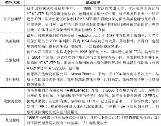 质子泵抑制剂即H+-K+-ATP酶抑制剂,主要作用机理为阻断胃壁细胞内质子泵驱动细胞内H+与小管内K+交换,从而阻止胃酸分泌的通道。其特点为作用快,持续时间长,抑酸效果好。质子泵抑制剂的主要代表药物有雷贝拉唑钠、奥美拉唑、兰索拉唑、泮托拉唑、埃索美拉唑、艾普拉唑等,基本情况如下所示: