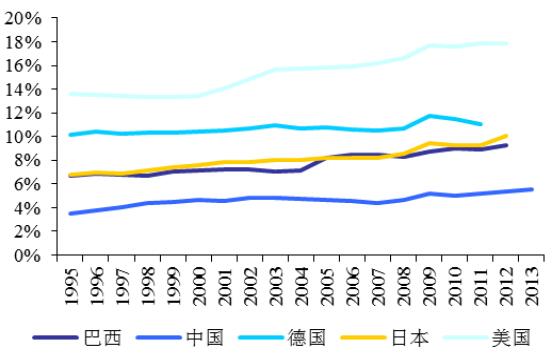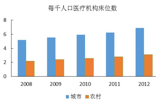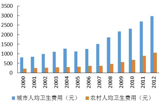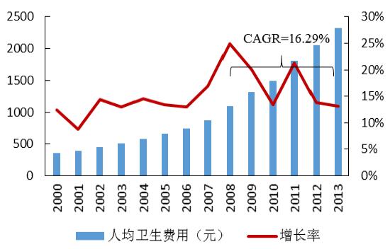 人均收入提升+健康意识加强+城镇化推进,推动我国健康医疗行业大发展。随着国民经济的发展,人均收入持续提升,对于健康的重视程度开始加强,在健康医疗方面的消费支出快速增长。可以看到,2013年人均卫生费用为2327.40元,相对于2008年的1094.5元增长了1.23倍,年均复合增长率达16.29%。虽然我国卫生总费用持续快速增长,占GDP的比重也在持续提升,但是相较于发达国家而言还有占比仍旧很低,还有很大提升空间。同时,我国城乡居民在人均卫生费用存在明显差异,农村的医院等基础医疗设施相对落后,随着城镇化的推进,在需求与供给端都将极大的推进我国健康医疗行业的发展。我国人均卫生支出近5年CAGR16.29%