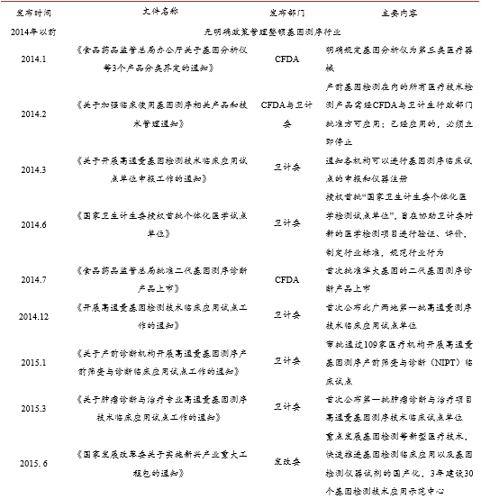 2014年7月2日,CFDA批准了华大基因BGISEQ-1000基因测序仪、BGISEQ-100基因测序仪和胎儿染色体非整倍体(T21、T18、T13)检测试剂盒(联合探针锚定连接测序法)、胎儿染色体非整倍体(T21、T18、T13)检测试剂盒(半导体测序法)医疗器械注册。这是CFDA首次批准注册的第二代基因测序诊断产品。之后一直到2015年3月,CFDA陆续批准了部分检验过关的二代基因测序诊断产品,为基因测序行业今后的健康发展奠定了基础,并逐步以批准试点的方式开展基因测序临床应用,整个行业开始进入健康的发展轨道。