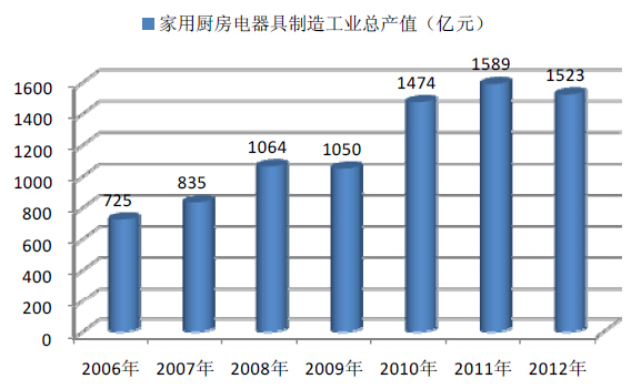 我国的厨房小家电行业始于上世纪80年代,虽较欧美日等发达国家和地区滞后近30年,但是发展后劲却很足。发展之初,厨房小家电仅仅包括电饭煲,开水壶等,产品单一,功能简单,市场规模小;进入90年代后,厨房小家电行业发展迅速,随着微波炉、电饭煲产品进入市场,厨房小家电种类迅速增多;到了21世纪,消费者对食品安全以及生活品质有了更高的要求,厨房小家电产品也从经济、耐用向环保、健康、时尚、个性化转型,各种高新技术和新材料被广泛运用于厨房小家电,产品多功能化、智能化的趋势非常明显。值得注意的是,在这个阶段还发展出一些将中国传统饮食文化和烹饪习惯与现代电器制造技术相结合并面向国内消费者的创新型产品,如豆浆机、电压力锅、陶瓷电炖锅等。与此同时,中国也已成为全球最主要的厨房小家电生产国,中国家电协会调查数据显示,“十一五”期间,中国厨房小家电在全球出口市场保持约60%的份额。2006-2012年中国厨房小家电产值增长情况/家用厨房电器具制造工业总产值(亿元)
