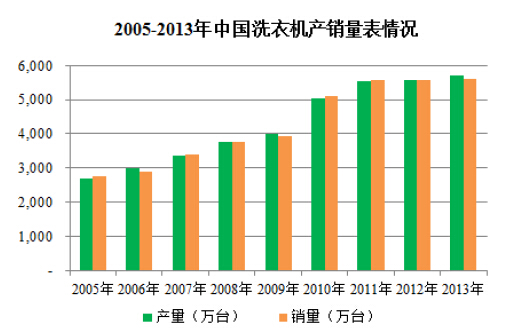 我国洗衣机产业起步较晚,但成长迅速。2001年,中国洗衣机产量达到近1,500万台,跃居世界第一。2013年,我国洗衣机产量和销量分别达到5,701.85万台和5,593.50万台,除2012年受家电下乡等政策陆续退出、经济增长回落等事件影响,洗衣机销量出现一定程度的下滑外,我国洗衣机产销量呈现良好的发展态势。