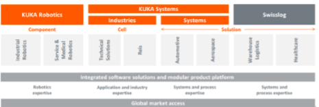 库卡业务主要包括三大板块:1)工业机器人制造、2)自动化控制系统两大业务、3)2015年收购瑞士Swisslog,专门为医院、零售、物流行业提供自动化解决方案等服务。