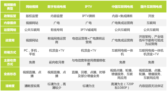 国内的各类视频服务都在政府监管之下,因此内容提供和行业运作方式均受到政府部门相关政策的影响。不同的服务类别主要通过提供服务的主体进行区分,电视端的内容服务整体还是在大的广电体系下进行运转。