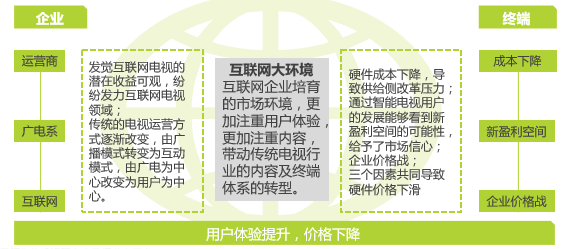 互联网的快速发展以及互联网在传统行业参与度的不断提升,导致传统行业也深受互联网的影响。一方面在对待用户的方式上,传统的电视行业是“广播”的方式,将观众作为“受众”,单方面的传递信息;而互动电视的发展,给观众更多的选择权。互联网电视给用户带来了更丰富的选择和更好的用户体验,而互联网电视及相关行业的参与者都开始致力于用户体验的提升。另一方面,终端的定位也开始发生变化,从单纯的硬件,逐渐发展成为内容的展示平台,有更多的拓展功能,并且这种模式的转变也为终端企业开拓了新的盈利空间,进而为硬件的转型又提供了推动力。因此互联网电视行业的发展是互联网的参与、市场的变革以及企业的改变共同推动的结果。