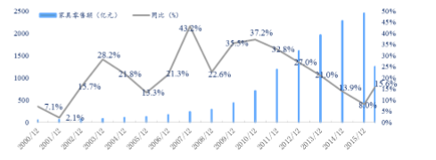 家具行业增速步入下行通道,行业增速已由过去30%-40%,下降到2015年9%。根据国家统计局数据显示,2015年我国家具类零售额2445亿元,同比增长16.10%;2016年上半年,家具类零售额1249亿元,同比下降0.93%至15.60%。