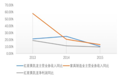 受家具市场不景气以及前几年家具卖场过度扩张的影响,近三年建材家居卖场销售额逐年下降,2015年建材家居卖场销售额为10844.5亿元,同比下降10%,建材家居卖场的销售模式进入衰退阶段。以家具卖场龙头企业红星美凯龙(表现优于行业内大部分公司)为例,其近三年公司主营业务收入、净利润增速均呈现下降趋势,2015年其主营业务收入为875,612万元,同比增速10.35%;净利润为409,807万元,同比增速9.53%。目前,红星美凯龙、居然之家等本土品牌放缓开店速度。